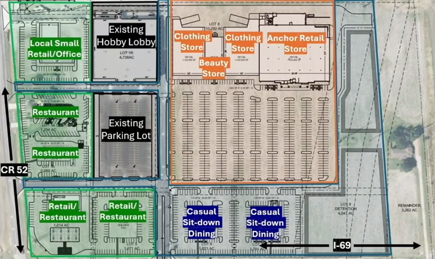 The project, located at the northwest corner of I-69 and CR-52, consists of restaurants and a 14,000-square-foot retail center intended for local or small businesses, with a total private investment of nearly $54 million.
