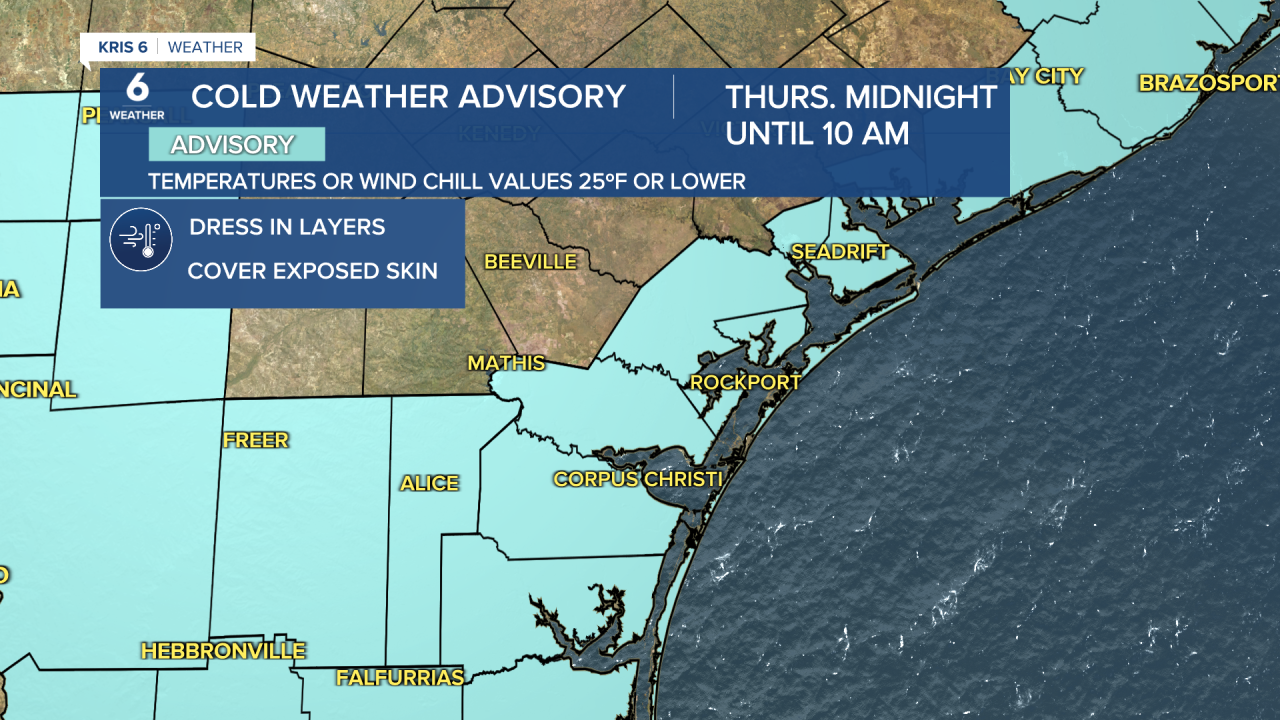 - Cold Weather Advisory goes into effect at midnight through Thursday, 10 a.m.