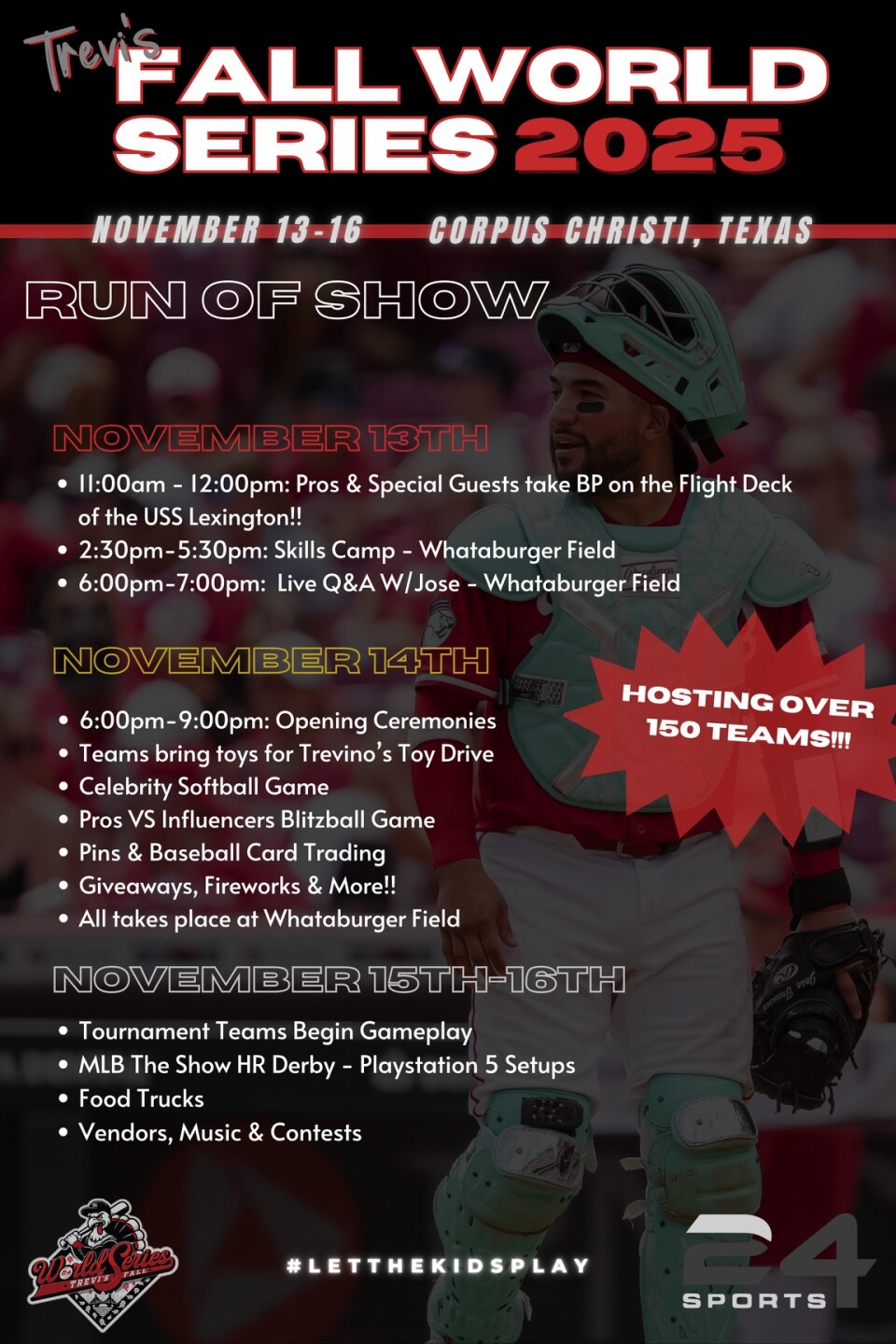 If you missed Thursday's event, you have another chance to see Jose Trevino, along with having some community fun during a Celebrity Softball Game, Trevi's Toy Drive, and more tournaments. Trevino will be hosting over 150 teams during his annual Fall World Series. Check out the full list of events below.