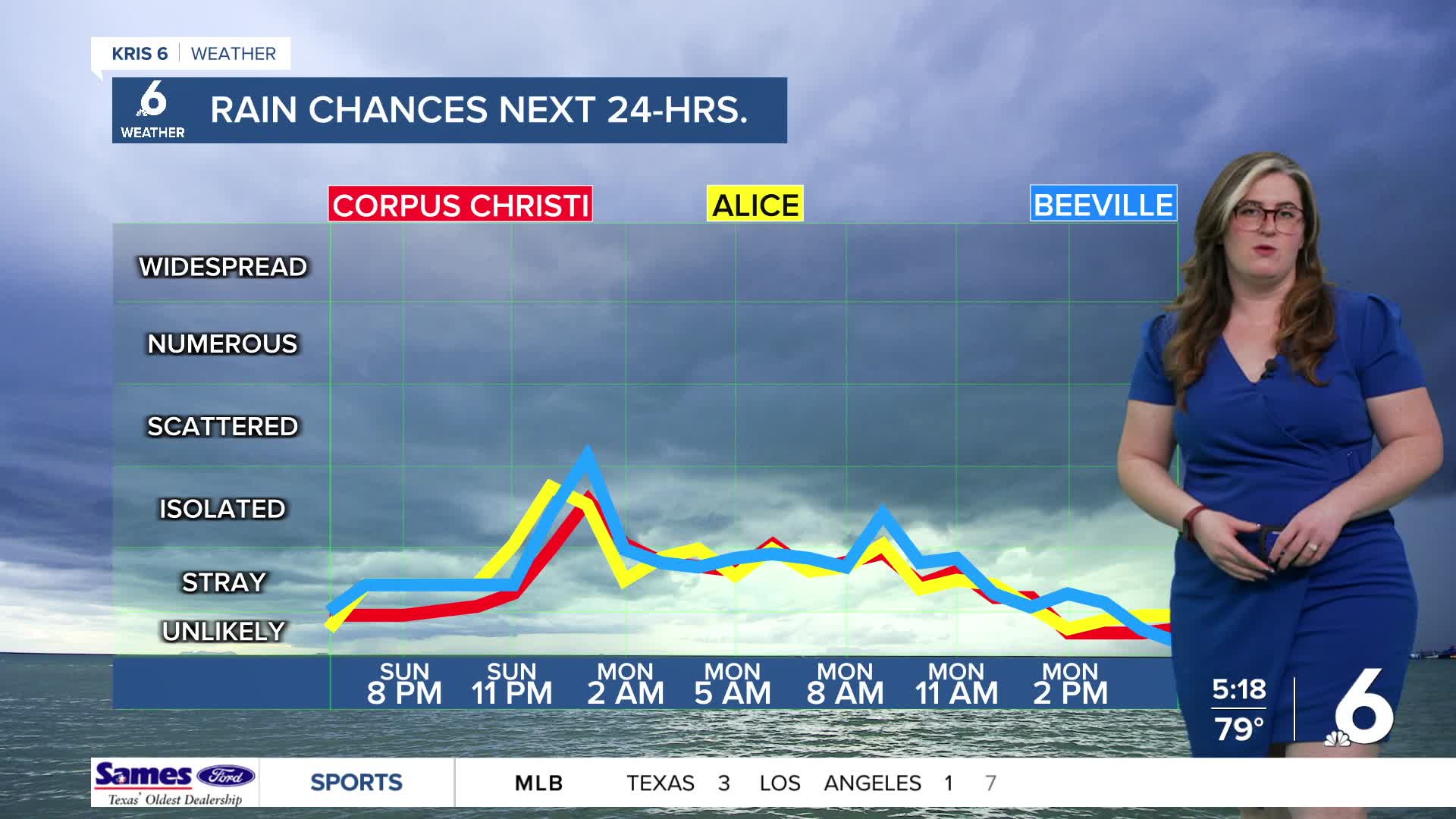 I'm watching for the possible development of a line of storms near the Interstate 35 corridor. If these storms develop and hold together, neighbors in Live Oak and Bee Counties could see some "sporty" storms. This is expected closer to midnight, so please have multiple ways to receive weather alerts just in case!