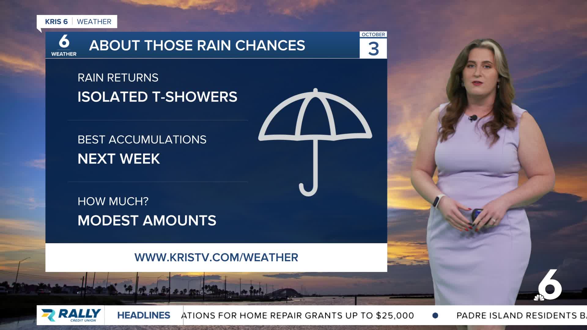 It may not feel like fall with the return of that familiar 'air-you-can-wear' to the Coastal Bend, but try not to complain. We need the muggy air so that rain can return to our forecast— and that's just what to expect for Friday. The morning may begin with patches of fog for the early commute. A few isolated showers are expected near the coast, especially during the afternoon when temperatures warm to the lower 90s. Expect this to be the trend throughout the weekend. A coastal trough, or 'wrinkle' of low pressure, should help promote showers — the afternoon sea breeze will also pitch in to keep showers in the forecast over the next few days.