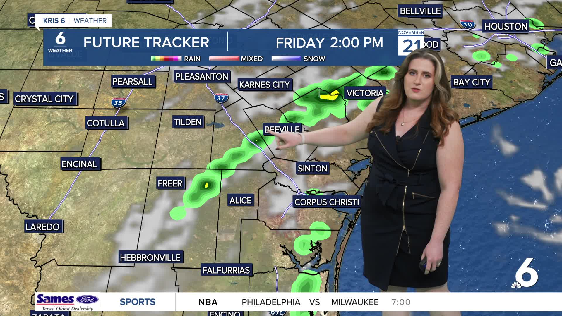 Highs will still reach the upper 80s Friday afternoon, which is near-record. 'Feels like' temps will crest in the low to mid 90s. While our weak cold front fizzles out on our doorstep this weekend, another cold front is expected to reach the Coastal Bend on Tuesday. It will drop temps, down closer to where we normally expect them for this time of year (mornings in the 50s, afternoons in the 70s). This cold front seems to arrive before Thanksgiving, with an extra reinforcing push of cooler air on Thanksgiving. This will stretch our rain chances right up to Turkey Day, with chilly temps on Thanksgiving!