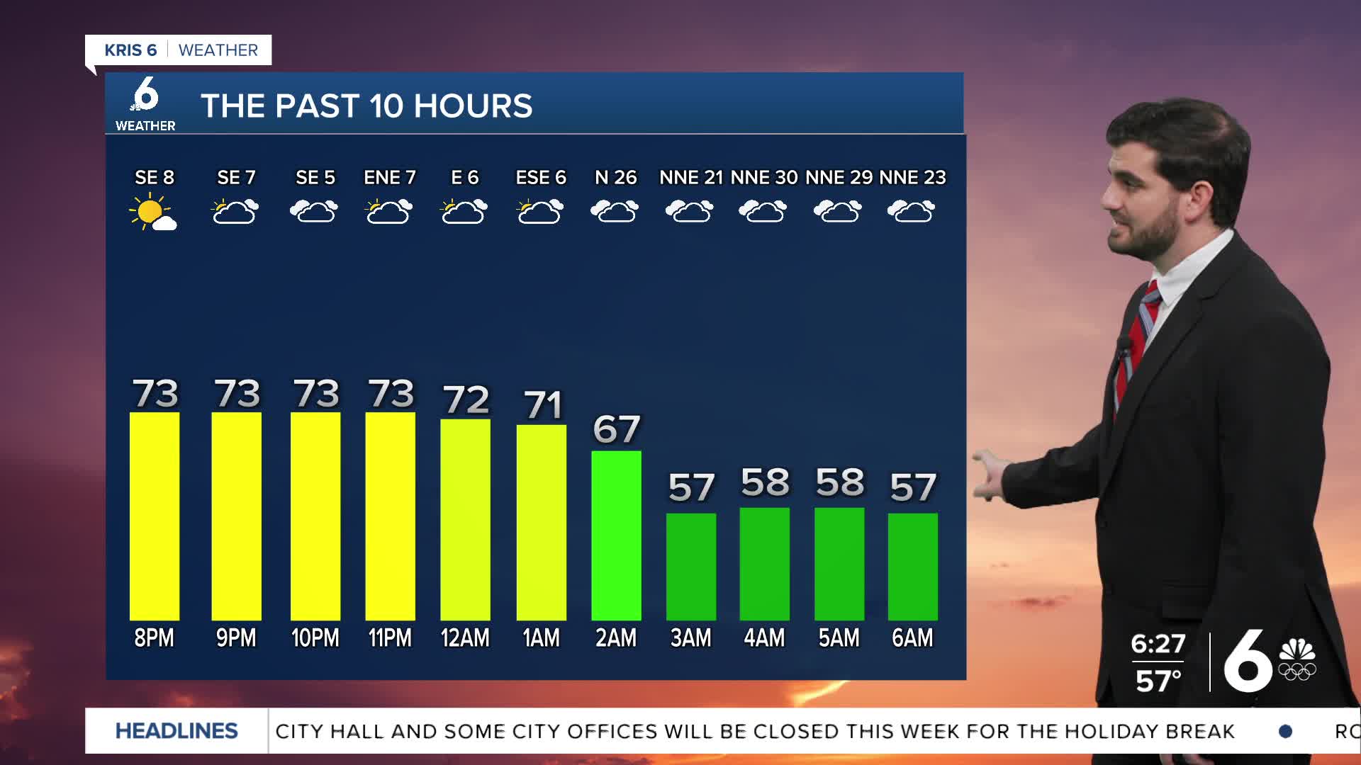 This morning early we saw the cold front finally make its way to and through the Coastal Bend! Around 1am we still had 70s, but we 3am we were in the 50s across the majority of the area. Winds have gotten into the 30 and 40mph range and could stay that high through the morning commute hours. As we go into the afternoon they should let up some as the cloud cover holds on without any rain in sight. Tomorrow we'll hold the cooler temperatures before a warm up starts and pushes us back into the 80s by the weekend.