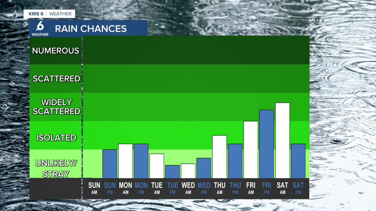 Is that you, summer? Oppressive humidity is back with very warm temperatures. This combo means heat risk will be higher across the Coastal Bend. Afternoon highs rise to the upper 80s and lower 90s across our Coastal Bend neighborhoods, and 'feels like' temps will be even hotter. Please be sure to hydrate! Expect a mix of sun and cloud on Monday and Tuesday— don't forget your sunscreen (SPF 30 or better). Damaging UV rays can still reach you on cloudy days!