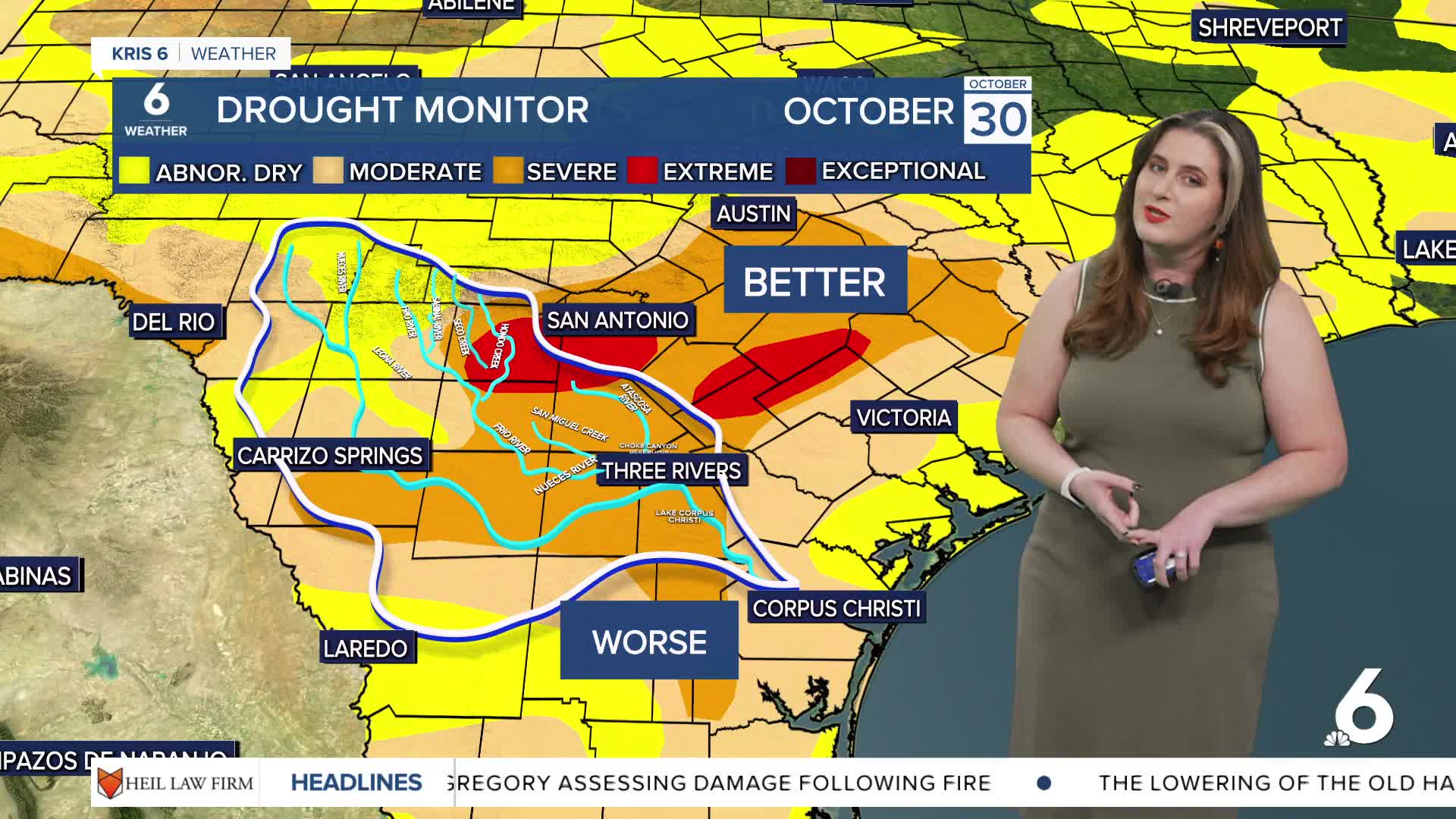 Lows will drop to 40s across our neighborhoods, so don't put your sweater away just yet! High temps on Halloween will creep into the upper 70s. Humidity is slowly coming back to the Coastal Bend as winds become onshore Friday afternoon. This will help improve the fire danger across the Coastal Bend, gradually. Expect Moderate to High Fire Danger (2-3 out of 5) on Friday. While this is much safer, please avoid any activities that could cause a spark! A Red Flag Warning remains in place until 10 p.m. Thursday.