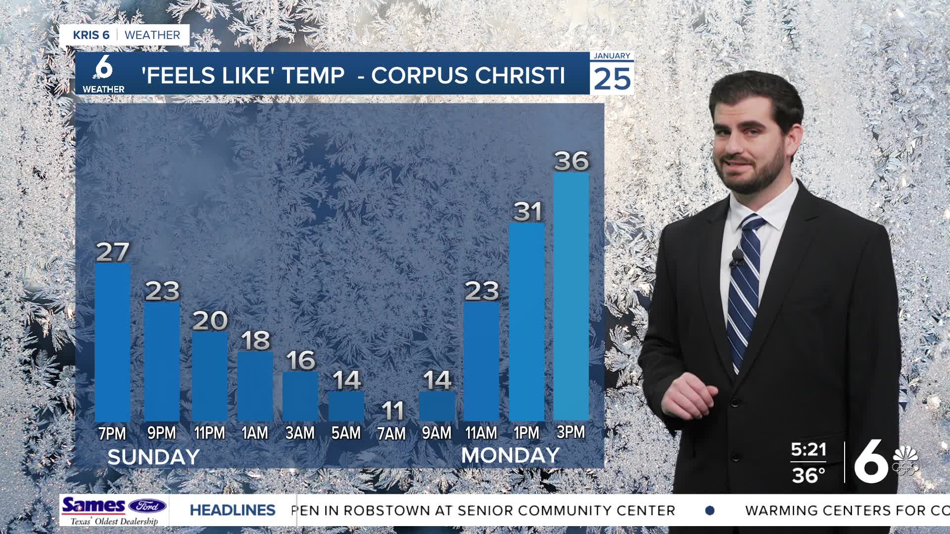 As we went through our Sunday temps never broke out of the 30s here in Corpus Christi. Tonight with cloud cover making a run for the gulf we're going to cool off even more with temperatures falling into the 20s and wind chills in the teens. By tomorrow daytime highs should get to the mid 40s thanks to plentiful sunshine, but keep in mind that tomorrow night will cool off fast also thanks to the clear skies sticking around. After this we can expect warmer temperatures into the middle of the week with temps pushing the 60s by Wednesday into Thursday before our next front could potentially push in just in time for next weekend. Either way make sure to continue protecting the four P's as we head into the start of this week with the cold weather sticking around the next couple of days!