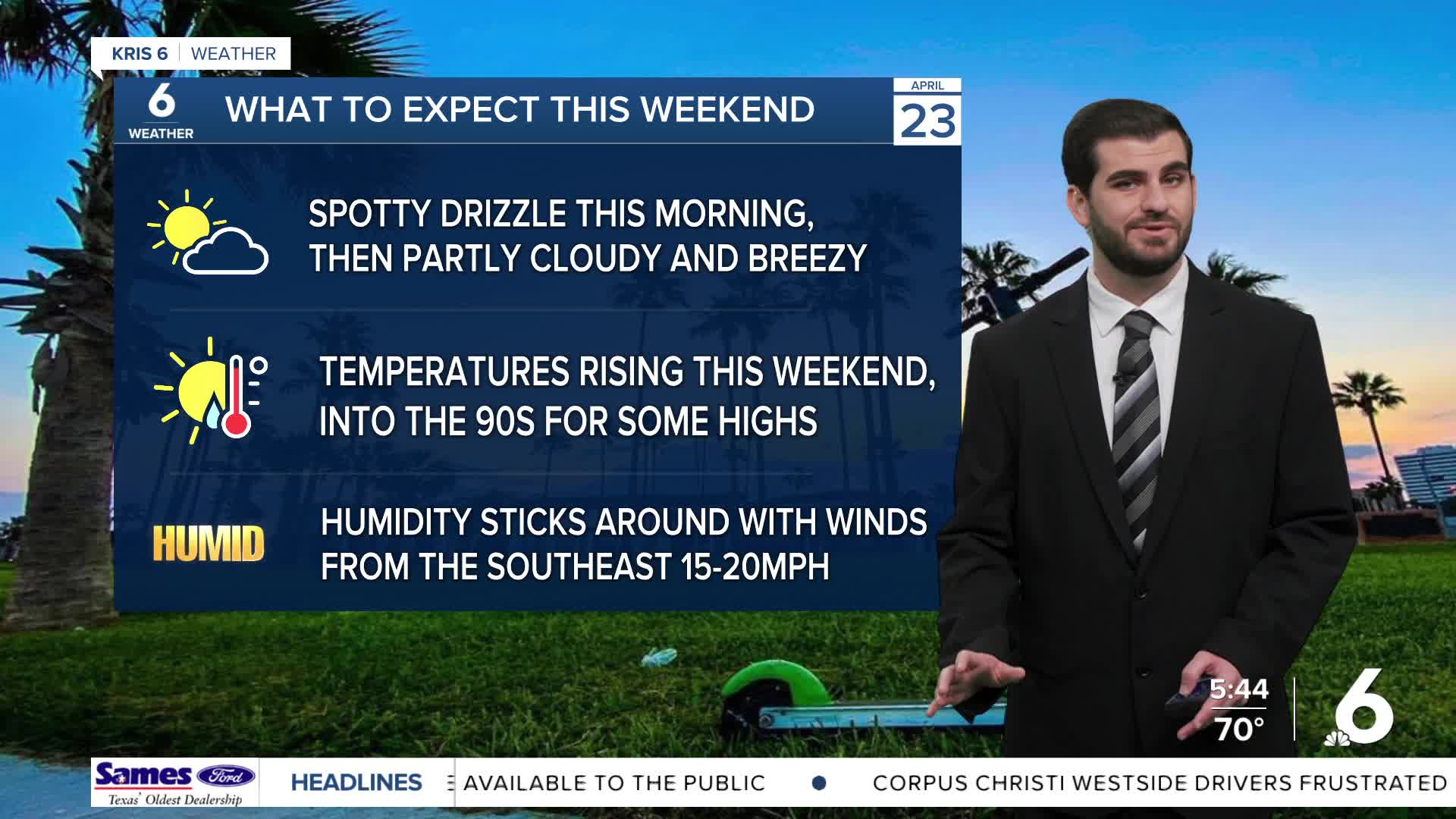 The main focus of the current forecast is going to be the temperatures, for Thursday we'll be pushing the mid to upper 80s for daytime highs. By Saturday we look to be closer to 89F and likely pushing into the lower 90s for inland neighborhoods towards Duval and Jim Wells counties. I do have Corpus Christi also pushing into the lower 90s for Sunday for my latest forecast this morning. Either way it's going to be above average, and when you combine that with our dew points in the low 70s we're all going to be feeling the heat this weekend!