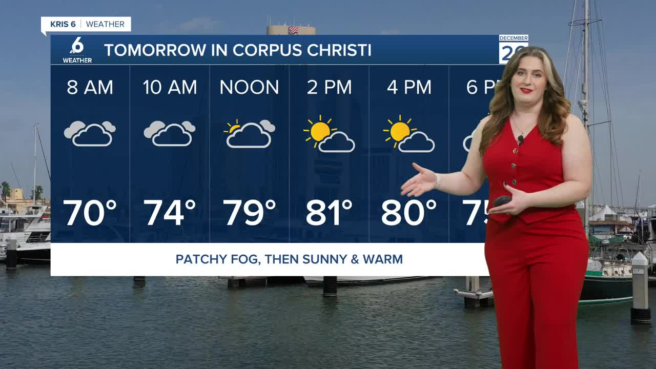 More fog tonight, but this time it'll be more patchy in coverage. Expect morning lows to be in the upper 60s and afternoon highs to reach the lower 80s. Our last chance of rain for 2025 will come on Sunday. A cold front will pass through our neighborhoods on Sunday evening. This looks to be a quick period of showers across the Coastal Bend, but it's still too early to know how much rain will fall.