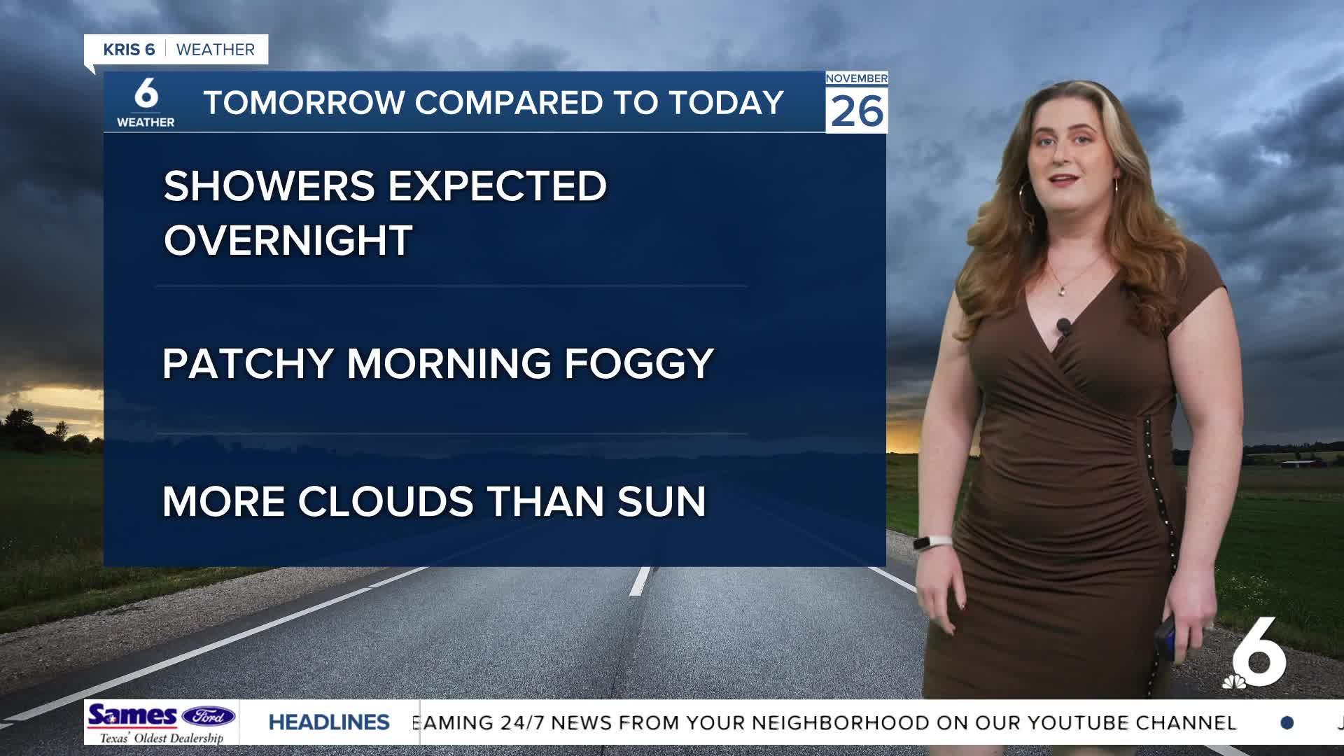 The Coastal Bend will again here the pitter-patter of rain early Wednesday morning, but don't expect much measurable rain. Patchy fog will accompany the rain and despite windy conditions. In fact, the wind will stick around throughout our Pre-Thanksgiving Hump Day. Wind gusts will range from 25- 30 mph. You can expect more clouds on Wednesday too. Winds will calm adn clouds will clear by Wednesday evening. Expect chilly temperatures Thursday morning and a very pleasant Thanksgiving afternoon!